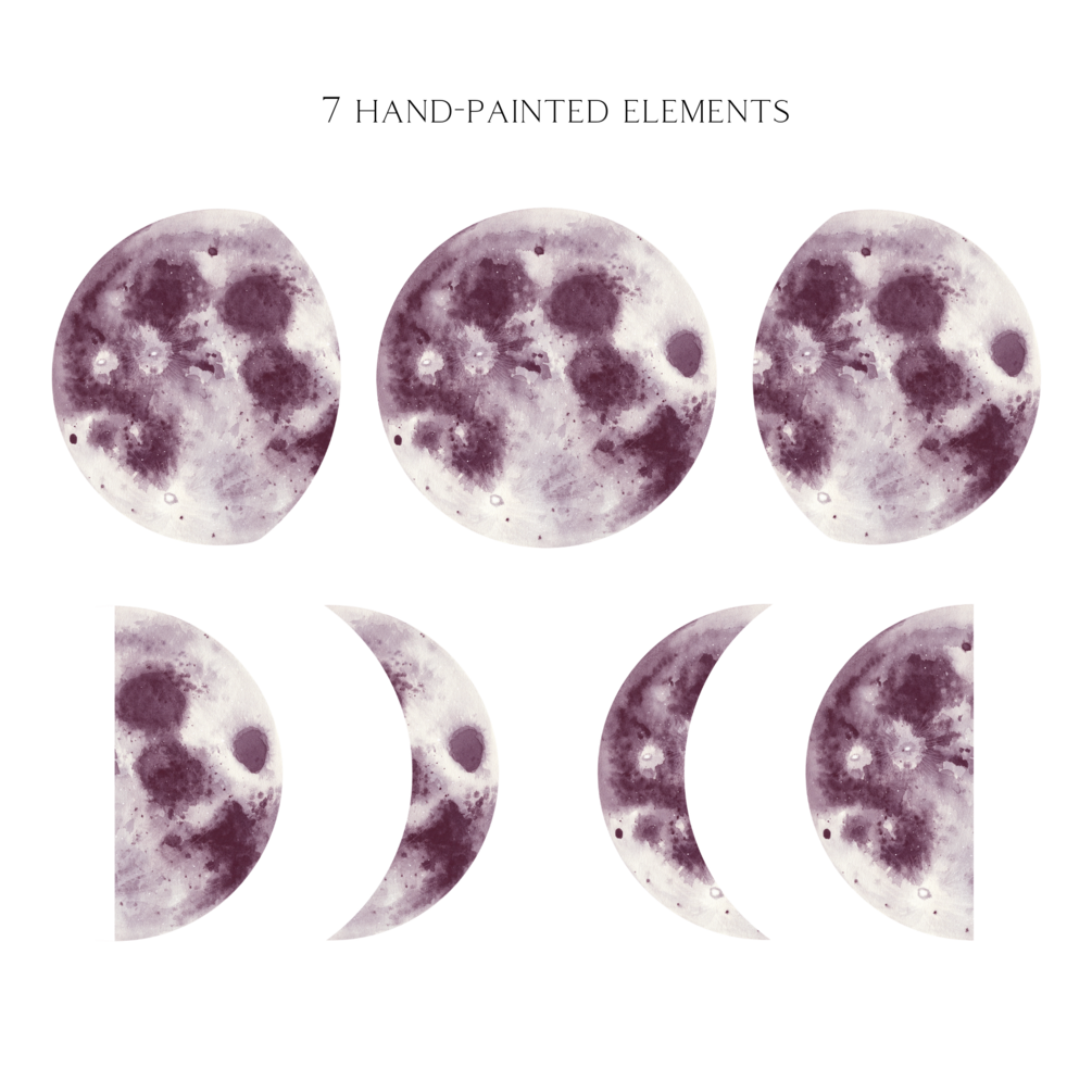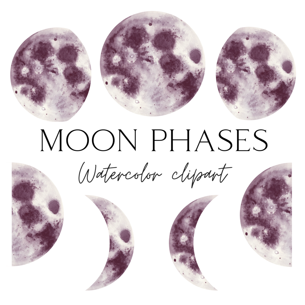 Clipart set of high-quality, hand-painted watercolor moon phases you can use for your personal projects, crafts, graphic design, scrapbooking, and other creative ventures.